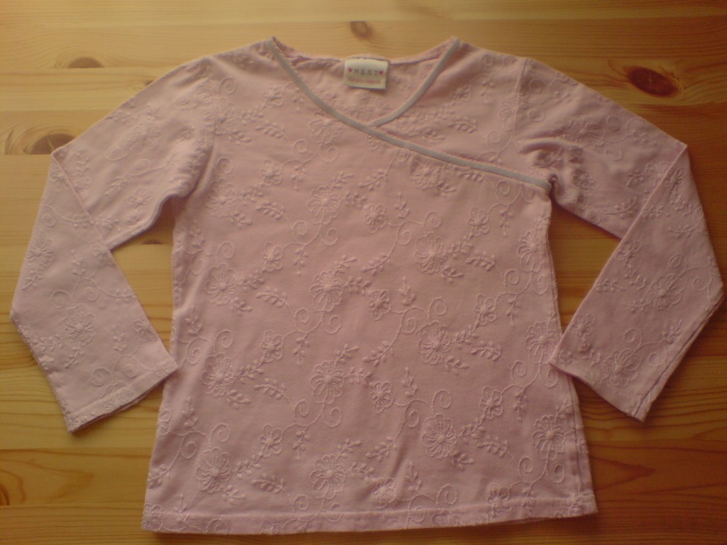 Rózsaszín,anyagában hímzett NEXT pamut felső,116-os,h 42,5 cm,uh 39+6 cm,sz 34 cm,1000 Ft