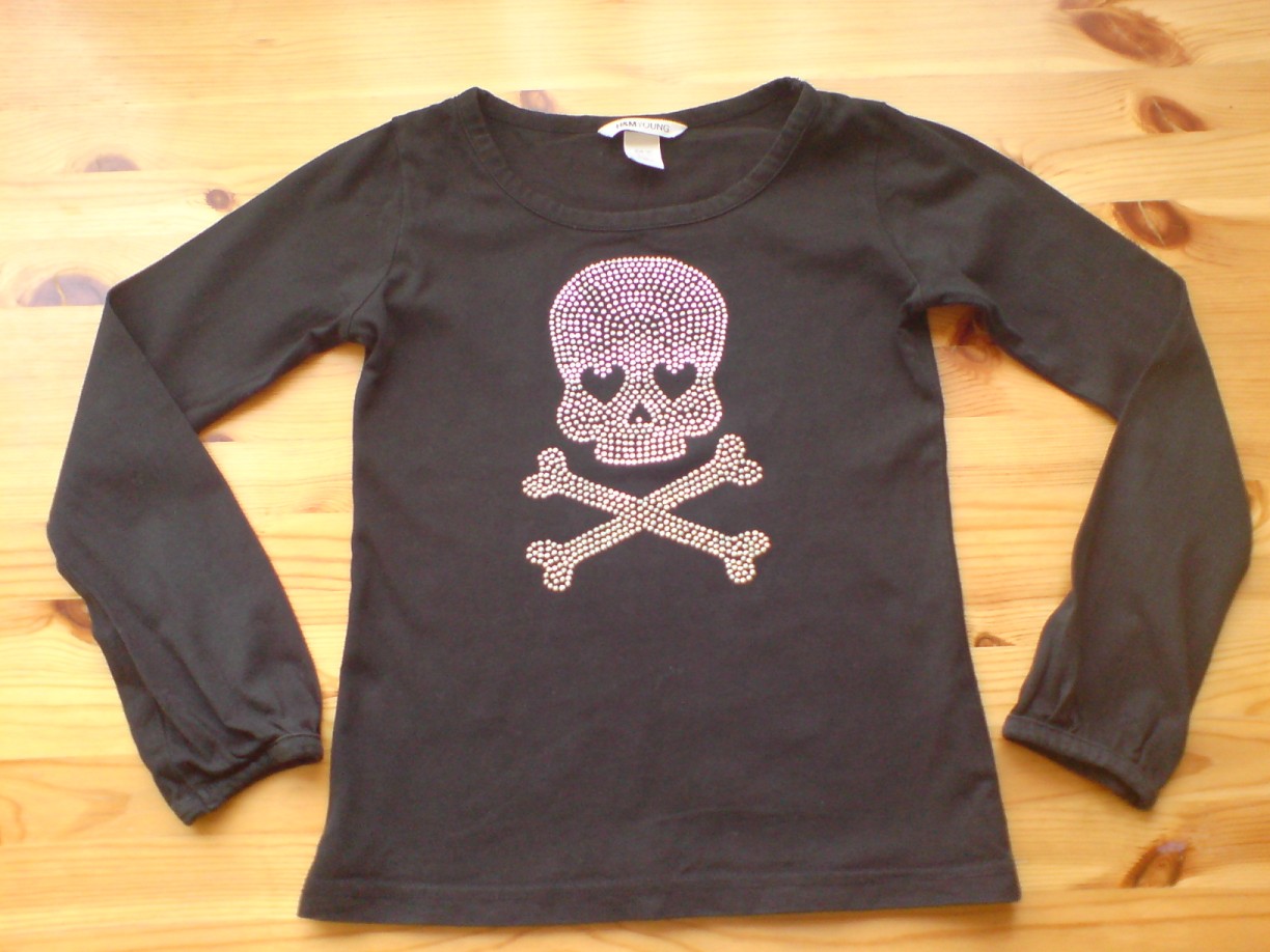 Szépséges strasszos koponyás H&M Young pamut felső . Mérete : 9-10 éves , 140-es Hossza : 47 cm Ujjahossza : 49 cm + 5 cm a válla Szélessége : 36 cm